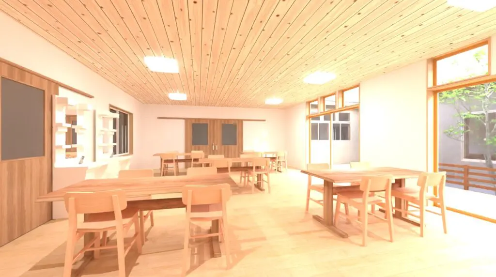 食堂も広く、皆さんが集まる場所が居心地よい空間になりそうで、完成が楽しみです